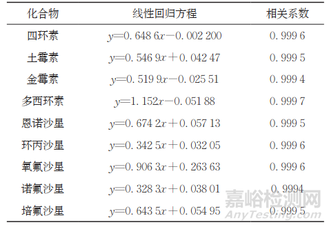 在空白海水魚基質中加入標準溶液,制備一系列低濃度加標水平的海水魚樣品(加標量1.00,2.00,5.00,10.00μg·kg−1),按照試驗方法測定。以信噪比接近3,10的加標量作檢出限和測定下限,檢出限和測定下限分別為2.00,5.00μg·kg−1。