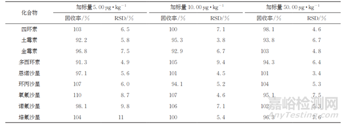 選取不合格率較高的空白黃花魚基質,在1,2,10倍測定下限水平下各進行6次平行加標回收試驗,計算回收率和測定值的相對標準偏差(RSD),結果見表2。