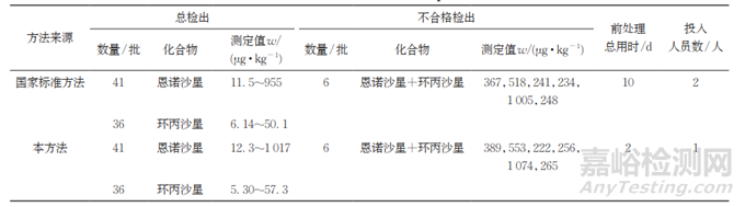 按照試驗方法分析2022— 2023年實驗室監(jiān)督抽樣中留存的200批海水魚樣品,檢出結果與當年實驗室監(jiān)督抽樣所用國家標準方法的進行比對。結果顯示:四環(huán)素類藥物均未檢出;在41批樣品中檢出了喹諾酮類藥物,其中41批樣品檢出了恩諾沙星,36批樣品同時檢出了環(huán)丙沙星,6批樣品中恩諾沙星和環(huán)丙沙星總檢出量超過國家標準規(guī)定(100μg·kg−1),比對結果如表3所示。
