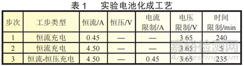 控制環(huán)境溫度在(23±5)℃范圍內(nèi),采用開口化成工藝,小電流工步設置為0.02C恒流充電且限時4h,大電流工步設置為0.2C恒流充電5min 后0.2C恒流恒壓充電且限時235min,并設置截止電流為0.02C,限制電壓為3.65V,如表1所示。