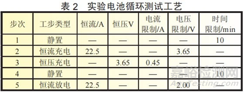 化成后電池封口清洗,常溫靜置3天后,采用0.67C電流進行電池分容操作,工步設為放-充- 放-充,分容電池下柜后靜置10天進行自放電篩選,選取良品電池進行室溫循環(huán)測試,充放電電流1C,工作電壓范圍2.0~3.65 V,循環(huán)測試工藝如表2所示。