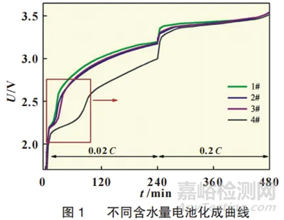 圖1中方形標識部位為化成過程的特征平臺,局部放大圖說明:極組水分高導致電池開路電壓在2.1~2.5V區(qū)間上升緩慢,達到相同電壓時需要更長時間。該特征平臺的延伸是受到水分與電解液的相互作用影響,由于電池中痕量水的存在會導致電解液中鋰鹽分解,負極材料表面發(fā)生了一系列副反應,導致鋰離子的脫嵌過程受阻,即: