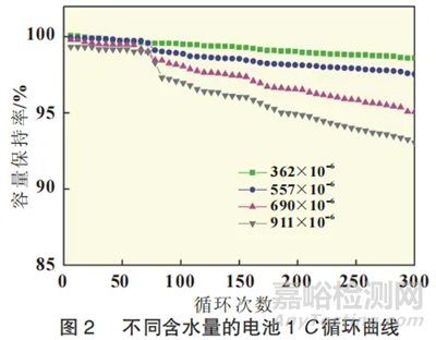 表現(xiàn)為化成過程電池開路電壓上升緩慢,嚴重影響電池的化成深度;同時,電池首次放電容量也將隨水分的增加而減小,電池首次放電效率也將大幅降低;電解液中PF5和HF的存在會破壞正負極材料與集流體間的黏結性,并會導致電池充放電循環(huán)過程中正極活性物質(zhì)的溶解與結構失穩(wěn);同時上述副反應生產(chǎn)的LiF和POF3會在SEI膜表面發(fā)生沉積,界面處離子遷移能力下降導致電池內(nèi)阻增大;電解液變質(zhì)與電極結構改變都是不可逆的,因此極組水分偏高電池容量會發(fā)生快速衰減,且極組水分含量越高,循環(huán)周期越長,電池容量衰減就越明顯。