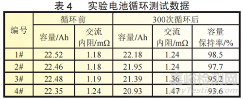 對比4組電池循環(huán)前后的電性能數(shù)據(jù)(表4),可以發(fā)現(xiàn):當電池極組水分低于550×10-6 時,即1#及2#實驗電池,電池充放電循環(huán)300次后,電池內(nèi)阻上升幅度較小,且電池容量保持不低于97%,說明電極結構及形貌相對穩(wěn)定