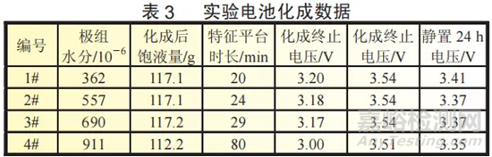 化成分為三個階段:小電流恒流階段,大電流恒流階段,大電流恒流恒壓階段。對比各組電池化成曲線發(fā)現(xiàn):高水分電池在小電流恒流充電階段電壓上升緩慢,且終止電壓偏低;在大電流恒流充電階段,高水分電池電壓躍升明顯,電壓變化幅度劇烈;恒流恒壓充電結束瞬間,電池開路電壓差異較小,但常溫靜置24h后,水分含量高的電池有明顯壓降,水分對電池化成過程產(chǎn)生了顯著的極化影響,如表3所示。