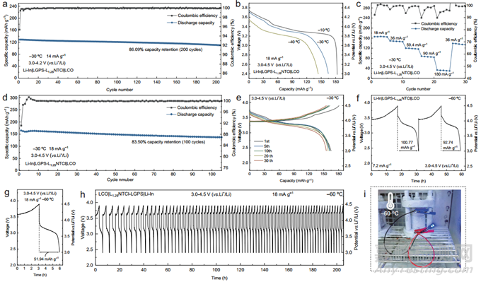 最引人關(guān)注的部分莫過于組裝好的全固態(tài)軟包電池在極寒條件下的充放電表現(xiàn)。作者采用的典型設(shè)計(jì)為L(zhǎng)iCoO2正極/XLi3N-TaCl5SSE/鋰負(fù)極,并在部分試驗(yàn)中引入LGPS中間層。測(cè)試條件包括放電倍率為18mA/g(接近C/10)或更低倍率,以確保在極低溫度下的有效測(cè)定。以下是論文強(qiáng)調(diào)的核心數(shù)據(jù)(對(duì)應(yīng)論文圖4一系列循環(huán)曲線和容量柱狀圖):