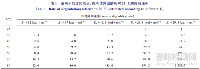 Ea實(shí)際測定需要進(jìn)行一系列復(fù)雜的工作。可采用保守和激進(jìn)的估算值對(duì)試驗(yàn)進(jìn)行預(yù)估,例如Ea采用較激進(jìn)的19.8 kcal·mol-1時(shí),當(dāng)某原料藥或制劑的加 速 試 驗(yàn) 條 件 為40℃/75%RH放置6個(gè)月(180d)時(shí),相當(dāng)于在70 ℃ 下放置11d(180d ×5.0÷80.6=11d),60 ℃ 下放置27d;當(dāng)Ea采用較為保守的17kcal·mol-1時(shí),由上表可知,加速條件40℃ /75,相當(dāng)于70℃下放置17d(180d ×4.0 ÷ 43.2=17d),60℃ 下放置35d;當(dāng)采用更加保守的Ea(12kcal·mol-1 )時(shí),相當(dāng)于70 ℃下放置33d(180d × 2.6 ÷ 14.3=33d),60℃下放置56d, 已 有 研 究 報(bào) 道 大 多 數(shù) 化 合 物 的Ea在20kcal·mol-1 以上[18],所以可采用較為激進(jìn)的Ea進(jìn)行預(yù)估。需要注意,以上不同溫度之間降解速率的換算需要基于降解反應(yīng)的濕度保持不變,因此,為了方便估算,建議高溫降解反應(yīng)的濕度保持與加速條件一致(如75% RH)。如果沒有證據(jù)表明更加劇烈的溫度會(huì)影響藥物的降解途徑,可以采用更高的溫度進(jìn)行試驗(yàn),以節(jié)省反應(yīng)的時(shí)間,以 Ea 采用18kcal·mol-1 為例,110℃下反應(yīng)16h 相當(dāng)于長期條件25℃/60%RH下放置18個(gè)月[19]。