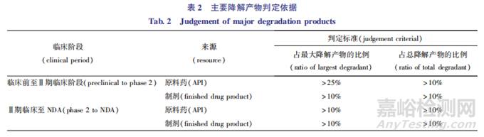 化學(xué)仿制藥的降解途徑和主要降解產(chǎn)物已有報(bào)道。 如抗流感藥物帕拉米韋注射液原研藥品的主要降解途徑/ 降解雜質(zhì)在日本PMDA審評(píng)文件中已有論述[21],其主要降解雜質(zhì)為羧基手性消旋雜質(zhì)(C-1異構(gòu)體雜質(zhì));在注射液Q1Q2一致的基礎(chǔ)上,其降解途徑應(yīng)與原研藥品基本一致,故一般無需再通過對(duì)主要降解產(chǎn)物進(jìn)行歸屬來重復(fù)這些背景知識(shí)[22]。創(chuàng)新藥的結(jié)構(gòu)新穎,降解途徑未可知,對(duì)其強(qiáng)制降解條件下主要降解產(chǎn)物進(jìn)行歸屬,對(duì)了解其降解路線具有重要意義。 目前各國藥品監(jiān)管部門均無對(duì)主要降解產(chǎn)物的判定進(jìn)行論述,主要降解產(chǎn)物的判斷也應(yīng)當(dāng)結(jié)合藥物的正式穩(wěn)定性的研究結(jié)果進(jìn)行判斷。 國外業(yè)界所報(bào)道的判定方法或觀點(diǎn)如下[19,23-24]:第一種方法是一條經(jīng)驗(yàn)性的判斷方法(表2) ,具體規(guī)定為對(duì)固體樣品,主要降解產(chǎn)物應(yīng)至少為0.25% ;對(duì)于液體樣品,主要降解產(chǎn)物應(yīng)至少為1% ,總降解產(chǎn)物不超過20% 。 當(dāng)滿足該前提條 件 時(shí), 可根據(jù)下文對(duì)主要降解產(chǎn)物 進(jìn)行判定。