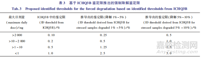該判定方法具有階段性,規(guī)定了不同申報(bào)階段的判定標(biāo)準(zhǔn)。 例如,某原料藥在申報(bào)臨床試驗(yàn)申請( investigational new drug, IND) 階段,在光照條件下降解 了4.46% , 分 別 為 雜 質(zhì)A(0.8% ) 、 雜 質(zhì)B(3.0% ) 、雜質(zhì)C(0.02% ) 、雜質(zhì) D(0.04% ) 、雜質(zhì)E(0.1% ) 和 雜 質(zhì) F( 0.5% ) 。雜 質(zhì) C、 D、E的 含量 <0.25% ,直接不作為主要降解產(chǎn)物;雜質(zhì) A、F分別占 總 降 解 產(chǎn) 物 的17.9% (0.8% ÷ 4.46% ) 、11.2% (0.5% ÷ 4.46% ) ,大于表中的上限10% ;另外,2 個(gè)雜質(zhì)的含量分別為最大降解產(chǎn)物的26.7%(0.8% ÷ 3. 0% ,大于限度25% )和 16.7% (0.5% ÷3.0% ,小于限度25% ),所以雜質(zhì)f不應(yīng)視為主要降解產(chǎn)物,故雜質(zhì)A、B為主要降解產(chǎn)物,應(yīng)進(jìn)行結(jié)構(gòu)確證;但當(dāng)該藥物進(jìn)行NDA申報(bào)時(shí),雜質(zhì)F應(yīng)進(jìn)行鑒定(16.7% ,大于限度10% )。另一種方法將ICHQ3A、3B中的鑒定限與強(qiáng)制降解的鑒定限進(jìn)行了關(guān)聯(lián),一般僅針對(duì)高溫固體降解試驗(yàn)。該判定方法的大致原理:首先,假定高溫固體降解試驗(yàn)與加速條件40℃ /75% RH 放置6個(gè)月達(dá)到了動(dòng)力學(xué)平衡;其次,保守估計(jì)若藥物在貨架期內(nèi)降解了 2% ,如在強(qiáng)制降解試驗(yàn)中應(yīng)降解5% ~10% ,經(jīng)計(jì)算,后者是前者的2.5~5倍,取其中較大的倍數(shù)5。當(dāng)以ICHQ3B中的鑒定限為基數(shù)再乘以相應(yīng)的 5倍時(shí),則可以推導(dǎo)出強(qiáng)制降解中的鑒定限(表 3)。