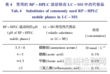 應(yīng)隨著創(chuàng)新藥研發(fā)的進(jìn)展不斷完善主要降解產(chǎn)物的結(jié)構(gòu)確證研究。反相高效液相色譜(RP-HPLC)是強(qiáng)制降解研究常用的分離手段,經(jīng)過評(píng)估確定的主要降解產(chǎn)物通常采用液相色譜 - 質(zhì)譜聯(lián)用儀(LC-MS) 進(jìn)行結(jié)構(gòu)確證,如主要降解產(chǎn)物降解量足夠大,也可通過制備色譜柱對(duì)其進(jìn)行分離,再結(jié)合其他技術(shù)手段(如核磁共振 NMR、紅外光譜IR、質(zhì)譜MS等)進(jìn)行進(jìn)一步確證。由于常用的RP-HPLC液相條件通常含有非揮發(fā)性的緩沖鹽,故采用LC-MS進(jìn)行結(jié)構(gòu)確證時(shí),可使用具有相似 pH 緩沖范圍的揮發(fā)性緩沖鹽對(duì)其進(jìn)行代替,如PH 5.5~8的RP-HPLC流動(dòng)相可在LC-MS采用PH 約為6.8 的10 mmoI·L-1醋酸銨溶液代替,并可以通過添加適當(dāng)醋酸或氨水調(diào)節(jié)PH,常用的RP-HPLC的替代流動(dòng)相見表4。需要注意LC-MS條件下 的 液 相 色 譜 保 留 組 分 與RP-HPLC的對(duì)應(yīng)關(guān)系,一般來說,若LC-MS方法中流動(dòng)相的PH與原始方法能基本保持一致,則二者的流出特征通常非常類似[25]。