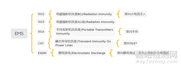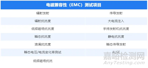 零部件測試項目主要分為EMI和EMS測試項目,當然還有含其他可靠性、電性能測試。我們主要看常見EMI和EMS測試項目,當然有一些車廠也會根據(jù)自身情況增加或者減少一些測試項目。