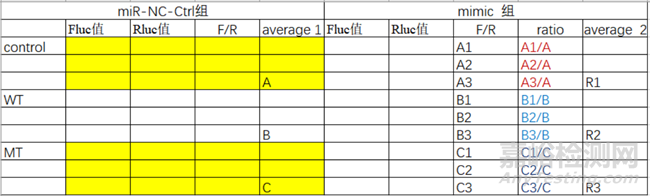 3.再以miRNA-Ctrl組的average1為標(biāo)準(zhǔn)1進行標(biāo)準(zhǔn)化,即用miRNA mimic組的F/R三個重復(fù)值分別除以相對應(yīng)組別average1得到三個比值