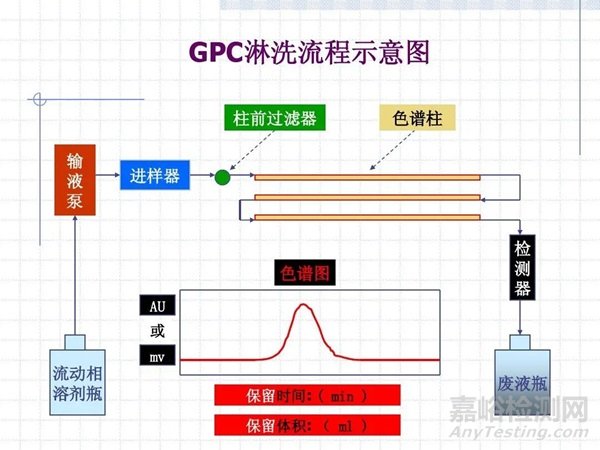 凝膠具有化學(xué)惰性,它不具有吸附、分配和離子交換作用。凝膠滲透色譜的分析是利用體積排除機(jī)理,色譜柱裝填的是多孔性凝膠或微粒,孔徑大小與待分離的聚合物分子相似。利用GPC分析高分子化合物分子量流程如下: