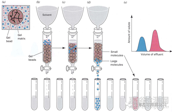 在檢測時,樣品進(jìn)入進(jìn)樣器后被淋洗溶劑帶入凝膠色譜柱,讓被測量的高分子化合物溶液通過一根內(nèi)裝不同孔徑的色譜柱,柱中可供分子通行的路徑有粒子間的間隙(較大)和粒子內(nèi)的通孔(較小)。當(dāng)聚合物溶液流經(jīng)色譜柱(凝膠顆粒)時,較大的分子(體積大于凝膠孔隙)被排除在粒子的小孔之外,只能從粒子間的間隙通過,速率較快;而較小的分子可以進(jìn)入粒子中的小孔,通過的速率要慢得多;中等體積的分子可以滲入較大的孔隙中,但受到較小孔隙的排阻,介乎上述兩種情況之間。