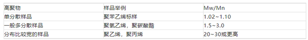 樣品間分子量分布寬度的比較,最直接的方法是將實驗所得到的分子量分布曲線作對比。還有一種更一般化且最常用的定量方法就是重均數(shù)均比,即:Mw/Mn。目前實驗上能夠合成的"單分散"樣品、一般多分散樣品、分子量分布比較寬的樣品的Mw/Mn值如表所示。