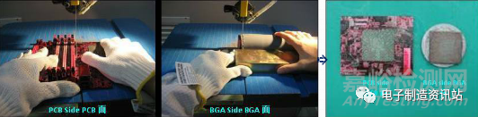 一般的BGA,其焊球的兩端應該分別連接電路板焊盤及元件本體,通過染色試驗,如果在原本應該是焊接完好的斷面出現(xiàn)了紅色染料,則表示這個焊點有斷裂現(xiàn)象。