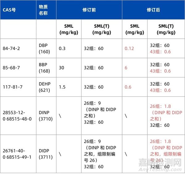 降低 DBP、BBP 和 DEHP 的特定遷移限值 (SML),增加了與 DBP、BBP 和 DEHP 總 SML 相關(guān)的組別限制編號 43;