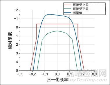 圖1:0.8赫茲的3倍頻程帶通濾波器,以對數(shù)標(biāo)度繪制相對阻尼與歸一化頻率的關(guān)系圖,并放大到帶通區(qū)域。測量到的濾波器響應(yīng)(藍(lán)色)超出了接受極限(紅色)。