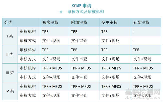 注:I類僅需符合KGMP條款4.1, 4.2, 5.5, 6.4, 7.1, 7.4, 7.5,7.6, 8.2.1, 8.2.2, 8.2.3, 8.2.6, 8.3, 8.5,其KGMP證書豁免定期延續(xù)審核,但仍需進(jìn)行變更或附加審核;II、III、IV類KGMP證書有效期為3年,到期前90天申請延續(xù)。