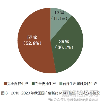 (1) 總體上:近40% 的國(guó)產(chǎn)創(chuàng)新藥采用委托生產(chǎn)方式。2016~2023 年獲批上市的142 個(gè)國(guó)產(chǎn)創(chuàng)新藥中,有56 個(gè)采用委托生產(chǎn)方式(包括完全委托生產(chǎn)與自行生產(chǎn)同時(shí)委托生產(chǎn)情形,下同),占比近40%(圖2)。其中,治療用生物制品較多采用委托生產(chǎn)模式(16/35,45.7%);其次為化學(xué)藥品(31/71,43.7%);中藥有1/3 采用委托生產(chǎn)模式(9/27,33.3%);根據(jù)《疫苗管理法》相關(guān)規(guī)定,目前9 個(gè)預(yù)防用生物制品全部為完全自行生產(chǎn)(表1)。從MAH 角度來(lái)看,142 個(gè)國(guó)產(chǎn)創(chuàng)新藥共涉及108 家MAH,其中采用委托生產(chǎn)方式持有國(guó)產(chǎn)創(chuàng)新藥的有51 家(包括39 家完全委托生產(chǎn)的MAH 與12 家自行生產(chǎn)同時(shí)委托生產(chǎn)的MAH),占比接近一半(圖3)。在完全采用委托生產(chǎn)的39 家MAH(共涉及42 個(gè)國(guó)產(chǎn)創(chuàng)新藥)中,僅持有B證的有37 家(94.9%),同時(shí)持有A 證(自行生產(chǎn))和B 證的1家,同時(shí)持有A 證、B 證和C 證(受托生產(chǎn))的1 家。