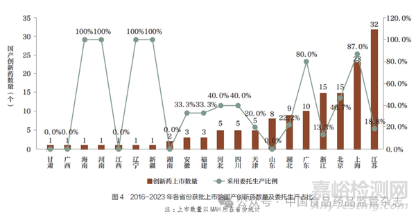 (2)分區(qū)域:北、上、廣國(guó)產(chǎn)創(chuàng)新藥委托生產(chǎn)占比更高。從地域分布看,2016~2023 年國(guó)產(chǎn)創(chuàng)新藥上市數(shù)量排名前5 位的省份分別為:江蘇(32 個(gè))、上海(23 個(gè))、北京(15 個(gè))、浙江(15個(gè))、廣東(10 個(gè))。其中,上海高達(dá)87.0%(20 個(gè))的創(chuàng)新藥采用委托生產(chǎn)模式上市,廣東8個(gè)(80.0%)、北京7 個(gè)(46.7%)。以上35 個(gè)國(guó)產(chǎn)創(chuàng)新藥中,有30個(gè)(85.7%) 由僅持有B 證的MAH 持有,充分體現(xiàn)出MAH 在激發(fā)創(chuàng)新活力、減少重復(fù)建設(shè)、提高現(xiàn)有產(chǎn)能利用率等方面的優(yōu)勢(shì)。此外, 新疆、遼寧、河南、海南雖均只有1 個(gè)國(guó)產(chǎn)創(chuàng)新藥上市,但也通過(guò)整合資源,采用了委托生產(chǎn)方式。2016~2023 年各省份獲批上市的國(guó)產(chǎn)創(chuàng)新藥數(shù)量及委托生產(chǎn)占比情況具體見圖4。
