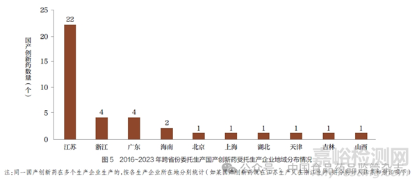 (1)跨省份委托生產(chǎn)普遍,江蘇、浙江、廣東為主要受托生產(chǎn)地。在上述56 個(gè)采用委托生產(chǎn)方式的國(guó)產(chǎn)創(chuàng)新藥中,本省份委托生產(chǎn)的有23 個(gè)(41.1%);跨省份委托生產(chǎn)的有33 個(gè)(58.9%),占比更高。其中,江蘇為跨省份委托生產(chǎn)中主要的受托生產(chǎn)企業(yè)所在省份,共涉及22個(gè)品種,遠(yuǎn)超其他省份;其次為浙江、廣東,分別涉及4 個(gè)品種(圖5)。