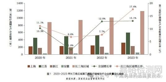 根據(jù)國家藥監(jiān)局公布數(shù)據(jù)顯示[6-10],截至2023 年底,長三角區(qū)域共有醫(yī)療器械生產(chǎn)企業(yè)8796家,占全國27.2%,生產(chǎn)第三類醫(yī)療器械的企業(yè)數(shù)量1188 家,占全國41.9%,2020~2023 年的第三類醫(yī)療器械生產(chǎn)企業(yè)數(shù)量年均增長率約10.7%,超過同期全國第三類醫(yī)療器械生產(chǎn)企業(yè)的平均增長速度,產(chǎn)業(yè)聚集效益明顯,如圖1 所示。