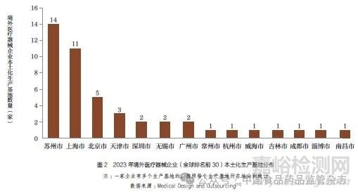 截至2023 年底,全球醫(yī)療器械企業(yè)排名前30 的企業(yè)[11] 中有20 家在長三角區(qū)域建立本土化生產(chǎn)基地,如圖2 所示,包括美敦力、強生、西門子、飛利浦等大型跨國企業(yè)。其中,江蘇和上海是境外醫(yī)療器械企業(yè)本土化落地首選地。