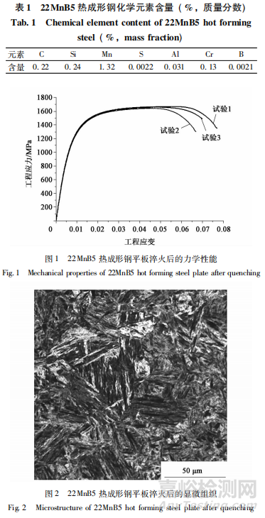 試驗材料為22MnB5熱成形鋼,化學成分見表1,材料厚度為1.5mm,按照某車型B柱的熱成形生產工藝進行平板淬火工藝處理,平板淬火工藝處理后的力學性能及顯微組織分別如圖1和圖2所示。