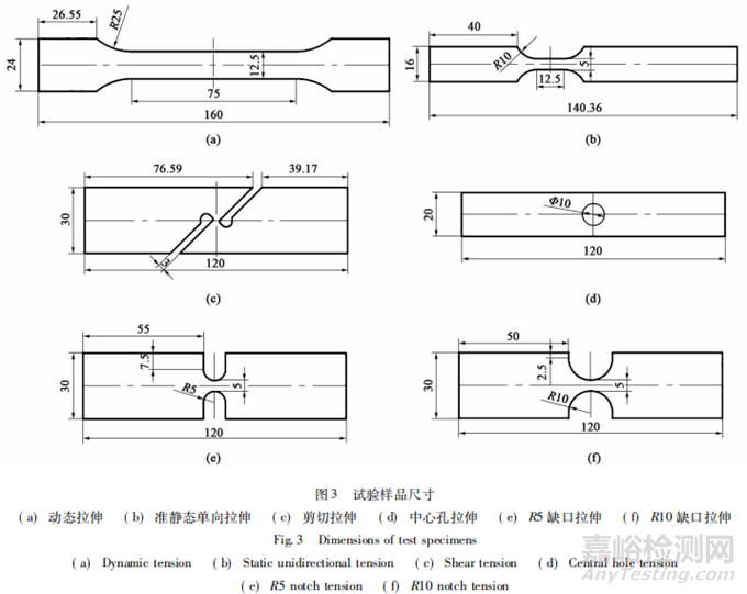 考慮應變速率對材料動態(tài)力學性能的影響,本次力學性能試驗選取了5個應變速率: 0.001、0.1、1、10、100和500s-1??紤]不同應變路徑對材料斷裂失效的影響,進行了典型的動態(tài)拉伸試驗、靜態(tài)單向拉伸試驗、剪切拉伸試驗、中心孔拉伸試驗、R5缺口試驗和R10缺口試驗。對利用線切割試樣進行加工,過程中盡量控制試樣溫度,防止影響材料性能,試驗樣品尺寸如圖3所示。