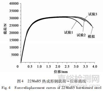 為了確定擬合系數α(范圍在0~1) ,并校驗材料塑性硬化表征的準確性,選取單向拉伸試驗 行試驗與仿真結果的比較,材料的彈塑性模擬采用LS-DYNA MAT24 材料模型,有限元模型單元采用0. 3mm的實體網格。選取典型單向拉伸試驗的對標結果作為討論,圖4所示為準靜態(tài)和動態(tài)單向拉伸試驗結果與模擬結果的對比。由圖4可知載荷-位移曲線吻合度較高,說明采用Swift-Herbet-Sherby硬化準則擬合,并通過逆向外推的方法可以很好地預測熱成形材料的塑性變形行為。