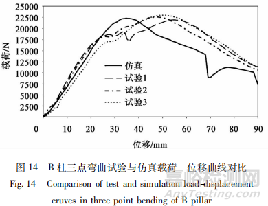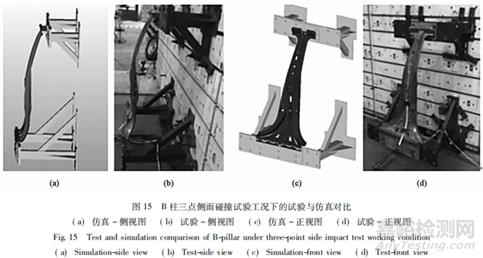 圖15為B柱動態(tài)側面碰撞試驗仿真與試驗結果對比,由圖可知,仿真與試驗的整體變形基本一致,由于試驗條件為模擬B柱在整車上的變形模式,B柱在試驗工程中未發(fā)生斷裂失效,從試驗與仿真結果的對比來看,其變形程度吻合度較高,說明材料的失效模型能夠有效地對零件在動態(tài)沖擊條件下的失效和變形行為進行表征。