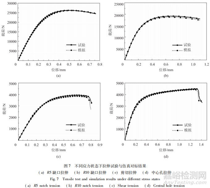 利用試驗和有限元仿真結果對所建立的Gissmo斷裂失效模型進行模擬驗證,最終的對標結果如圖7所示。由圖7可以看出,所建立的22MnB5熱成形鋼的Gissmo斷裂模型具有良好的正向預測性,可以很好地模擬在各種應力狀態(tài)下的拉伸試驗過程,各個應力狀態(tài)下的拉伸載荷-位移曲線均顯示模擬與試驗對標良好。
