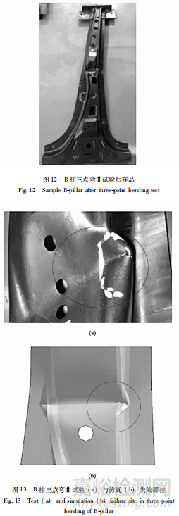 試驗用壓頭選用剛性壓頭,壓頭半徑為152mm。B柱試件兩端通過工裝剛性固定在試驗臺上,靜壓位置位于轎車后門上安裝鉸鏈處。試驗時采用準靜態(tài)加載方式,壓頭加載速度0. 002mm·s-1,出現明顯失效時停止加載,試驗過程及試驗后樣品狀態(tài)如圖12所示。