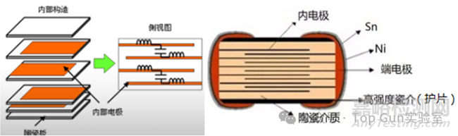 MLCC結(jié)構(gòu)主要包括三大部分:陶瓷介質(zhì),金屬內(nèi)電極,金屬外電極。而片式多層瓷介電容器它是一個多層疊合的結(jié)構(gòu),簡單地說它是由多個簡單平行板電容器的并聯(lián)體,結(jié)構(gòu)示意圖如下所示。
