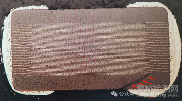 電極結(jié)瘤:電極結(jié)瘤會導(dǎo)致耐壓強(qiáng)度降低發(fā)生擊穿,與電應(yīng)力過大導(dǎo)致電極融入形貌相似。MLCC燒結(jié)時(shí)溫控失調(diào),有機(jī)物揮發(fā)速率不均衡,嚴(yán)重時(shí)會出現(xiàn)微裂紋。這些微裂紋在短時(shí)間內(nèi)可能不影響電氣性能,若未在生產(chǎn)環(huán)節(jié)檢驗(yàn)出來,在運(yùn)輸、加工、使用過程中裂紋可能進(jìn)一步增大。