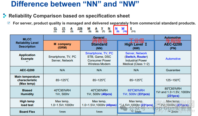 特別重要的,選型除了對規(guī)格參數(shù)進(jìn)行確認(rèn)外,還需要考慮MLCC的質(zhì)量等級是否與產(chǎn)品質(zhì)量需求所匹配。傳統(tǒng)的MLCC質(zhì)量等級只有消費(fèi)級和車規(guī)級,但是三星機(jī)電因?yàn)橐恍v史故事,因此在消費(fèi)級和車規(guī)級中間增加了工業(yè)級的分級。