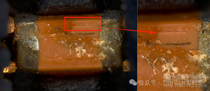 案例1:最常見的MLCC機(jī)械應(yīng)力失效,通常為典型的45°裂紋。