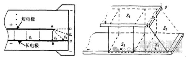因?yàn)閎足夠小,S2很小,因此S1/S2>>1,可得出E2>>E1。說明在A點(diǎn)的電場強(qiáng)度E2遠(yuǎn)大于均勻電場E1。上述分析僅針對下電極BC段,其實(shí)外電極CD段的E4對E2方向上的電場強(qiáng)度也有貢獻(xiàn),所以A點(diǎn)的實(shí)際電場強(qiáng)度比所分析的E2還要強(qiáng)。