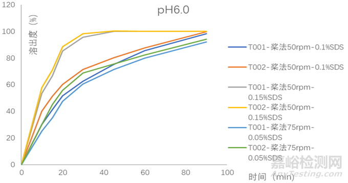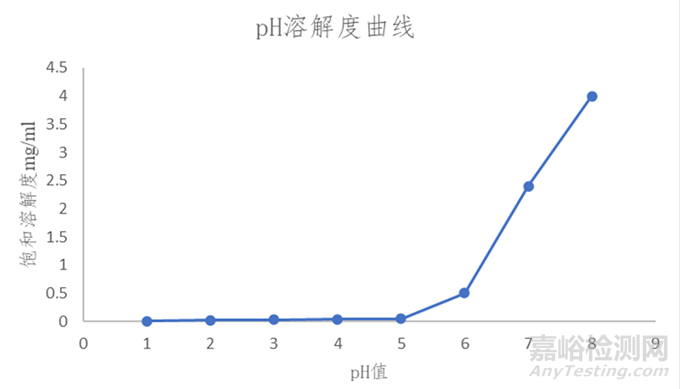 經(jīng)檢測(cè),該API的溶解度隨著pH升高不斷增大(如圖2所示),為pH依賴性藥物。其在偏酸性介質(zhì)中幾乎不溶解,當(dāng)pH值大于5.0后,溶解度顯著增大。分別使用不同粒徑API及不同工藝參數(shù)所制樣品按照FDA溶出方法進(jìn)行檢測(cè),結(jié)果均顯示為快速溶出,因此該方法無(wú)法很好地指導(dǎo)后續(xù)處方工藝的篩選,需開(kāi)發(fā)新的溶出方法。