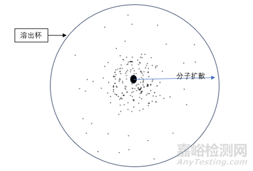 漏槽條件是指在37℃條件下,藥物所處釋放介質(zhì)的濃度遠(yuǎn)小于其飽和濃度,一般釋放介質(zhì)的體積須為藥物飽和溶液所需介質(zhì)體積的3~5倍。該條件的設(shè)定,亦是為了模擬藥物在人體的吸收分布:藥物在人體吸收后會(huì)迅速分布到體液,血液中的藥物濃度相較于吸收部位濃度要低得多,因此血液相對(duì)于胃腸道就會(huì)形成漏槽效應(yīng)。如圖1所示,藥物溶解后在杯內(nèi)逐步擴(kuò)散,若外圍濃度迅速達(dá)到飽和勢(shì)必會(huì)影響藥物的進(jìn)一步釋放,也就無(wú)法模擬藥物在體內(nèi)的吸收過(guò)程,此時(shí)漏槽條件就起到了體外溶出對(duì)體內(nèi)吸收的修正作用。那么有區(qū)分力的溶出曲線是否都需要滿足漏槽條件呢?首先,漏槽條件指的是API溶解特性方面的參數(shù),屬于方法學(xué)的范疇,而區(qū)分力則是指溶出方法的參數(shù),是為處方工藝開(kāi)發(fā)而建立的溶出曲線的一個(gè)特征。從制劑角度來(lái)看,溶出度和溶出本質(zhì)上并沒(méi)有直接的線性關(guān)系。在用于質(zhì)控的溶出實(shí)驗(yàn)中,一般期望制劑中90%以上的藥物能夠被釋放出來(lái),因此,溶出度檢測(cè)通常都會(huì)滿足漏槽條件,而溶出曲線的設(shè)置主要用于對(duì)比制劑之間的接近或偏離程度,和漏槽并沒(méi)有必然的聯(lián)系。