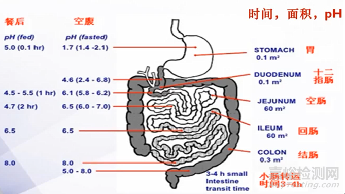 如圖2所示,藥物在人體內(nèi)的“旅行”會(huì)先后通過(guò)胃、十二指腸、空腸、回腸、結(jié)腸等器官,并在小腸(包括十二指腸、空腸、回腸)中停留時(shí)間最長(zhǎng)。另外,小腸的比表面積最大、小腸膜也比胃中的膜更具滲透性,因此絕大多數(shù)藥品的吸收都在小腸,而非胃中。由于胃腸道環(huán)境過(guò)于復(fù)雜,常規(guī)的溶出試驗(yàn)條件無(wú)需與胃腸環(huán)境完全一致,但溶出介質(zhì)的選擇應(yīng)考慮藥物的理化性質(zhì),并結(jié)合胃腸道環(huán)境的pH以及口服給藥后可能的暴露條件,如此才能最大程度上從藥品體內(nèi)行為角度出發(fā),更好地理解體外溶出數(shù)據(jù)。綜上,溶出介質(zhì)一般采用pH值1.2~6.8(37±0.5℃)的水性介質(zhì),特殊情況下可采用更高pH介質(zhì),但一般不應(yīng)超過(guò)8.0,且避免添加有機(jī)溶劑。對(duì)于硬膠囊、軟膠囊和明膠包衣片劑,可在溶出介質(zhì)中加入一定量的酶,來(lái)抵消明膠交聯(lián)作用對(duì)藥物溶出的影響。對(duì)于不溶于水或難溶于水的藥物,可考慮在溶出介質(zhì)中加入適當(dāng)?shù)谋砻婊钚詣?,但需充分論證加入的必要性和加入量(推薦濃度0.01%-1.0%)的合理性。