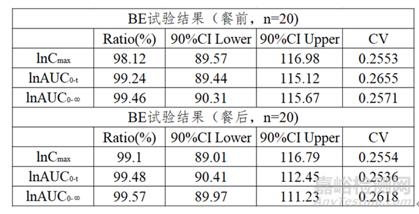 根據(jù)預(yù)BE結(jié)果推測(cè)自制品有較大概率能通過(guò)正式BE,進(jìn)而設(shè)計(jì)正式BE方案為兩制劑、單次給藥、兩序列、兩周期、空腹及餐后各20例。數(shù)據(jù)結(jié)果(圖8)顯示自制品與參比制劑具有生物等效性。