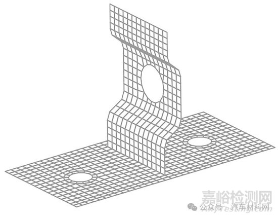 本文選取常見的T 型焊接接頭作為研究對象,在現(xiàn)有熱成形產(chǎn)品中截取典型區(qū)域作為測試件,用于疲勞仿真分析。為了進行對比研究,中等強度鋼采用Q345 板材,并將其成形為同樣形狀的零部件,連接板采用Q345 板材。測試件與連接板厚均為3 mm,測試件與連接板之間采用氣體保護焊,焊絲選用JQ.MG50-6。研究對象整體結(jié)構(gòu)如圖1 所示。