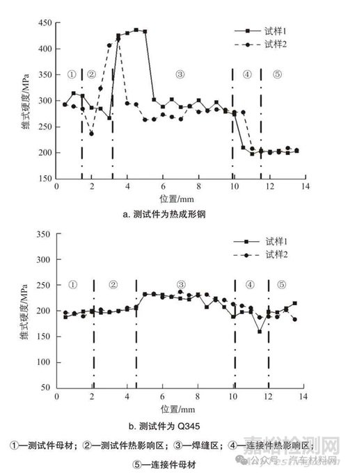 測試件為熱成形鋼的焊接接頭各區(qū)域顯微硬度測試結(jié)果如圖4a 所示,測試件為Q345 的焊接接頭各區(qū)域顯微硬度測試結(jié)果如圖4b 所示。從圖中可以看出,熱影響區(qū)寬度約2 mm,熱成形材料的熱影響區(qū)性能有所降低,Q345 材料的熱影響區(qū)性能變化不明顯。