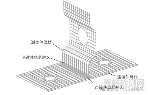 焊接接頭可劃分為5 個區(qū)域,分別為測試件母材、測試件熱影響區(qū)、焊縫區(qū)、連接件熱影響區(qū)、連接件母材,焊接接頭區(qū)域劃分如圖3 所示。焊縫區(qū)域材料硬度偏高且材料堆積,在仿真分析中使用剛性連接對焊縫做近似處理。