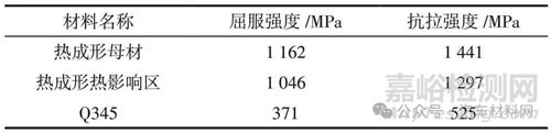 熱成形母材與Q345 母材的材料性能由拉伸試驗獲得,熱影響區(qū)材料性能根據(jù)顯微硬度測試結(jié)果計算獲得。由于Q345 母材與熱影響區(qū)材料性能差異不大,因此均按Q345 母材設(shè)置。材料力學(xué)性能參數(shù)見表1。