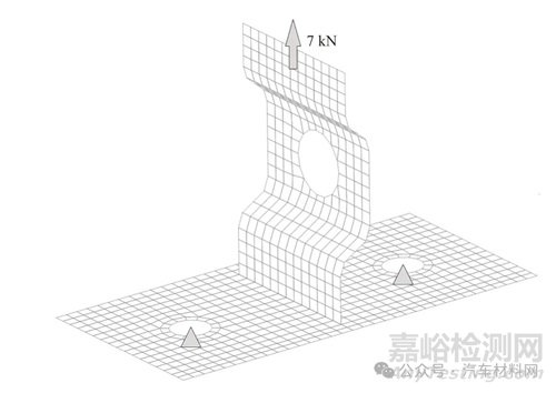 使用ABAQUS軟件對仿真分析模型進行準(zhǔn)靜態(tài)分析,模型約束和加載如圖6 所示。連接件兩個安裝孔固定,測試件上部加載7 kN 載荷。
