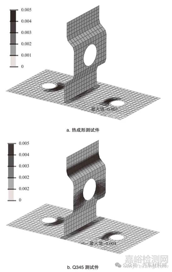 準(zhǔn)靜態(tài)分析結(jié)果應(yīng)變分布云圖如圖7 所示。從圖中可以看出,在焊接接頭周邊區(qū)域存在一定的塑性變形。Q345 測試件的焊接接頭塑性應(yīng)變?yōu)?.004,熱成形測試件的焊接接頭塑性應(yīng)變?yōu)?.003,熱成形件焊接接頭塑性應(yīng)變偏小。此處并未出現(xiàn)由于連接件一側(cè)材料強度低,從而導(dǎo)致應(yīng)力和變形集中的情況。