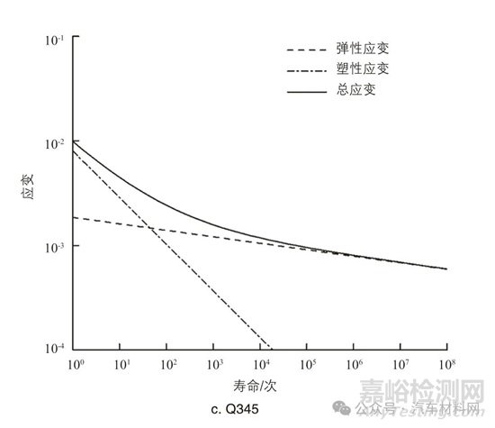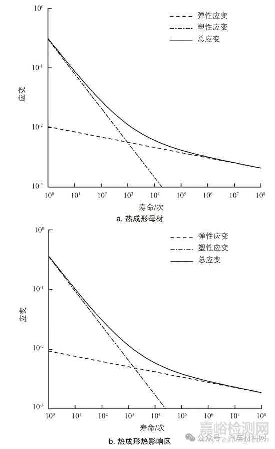 考慮到產(chǎn)品在準(zhǔn)靜態(tài)分析中已出現(xiàn)輕微塑性變形,分析對象不滿足高周疲勞條件,因此仿真分析中將使用E-N曲線,開展低周疲勞仿真分析[6]。將上述準(zhǔn)靜態(tài)分析結(jié)果導(dǎo)入HyperLife軟件,定義不同區(qū)域材料的E-N曲線如圖9所示。